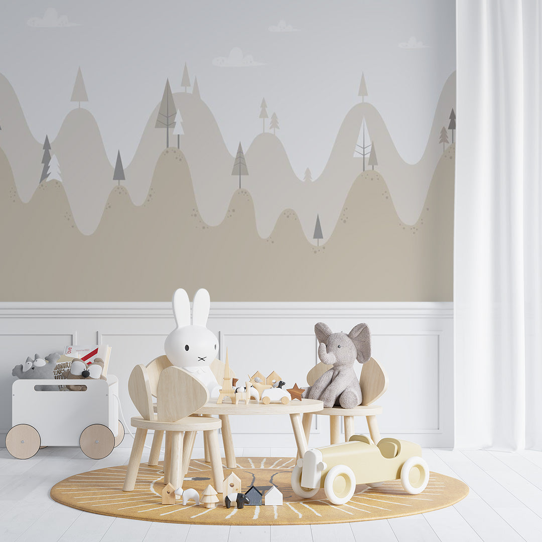 Kids Wall Murals Simple Design Beige Mountains Tree Nursery Wallpaper for Kids
