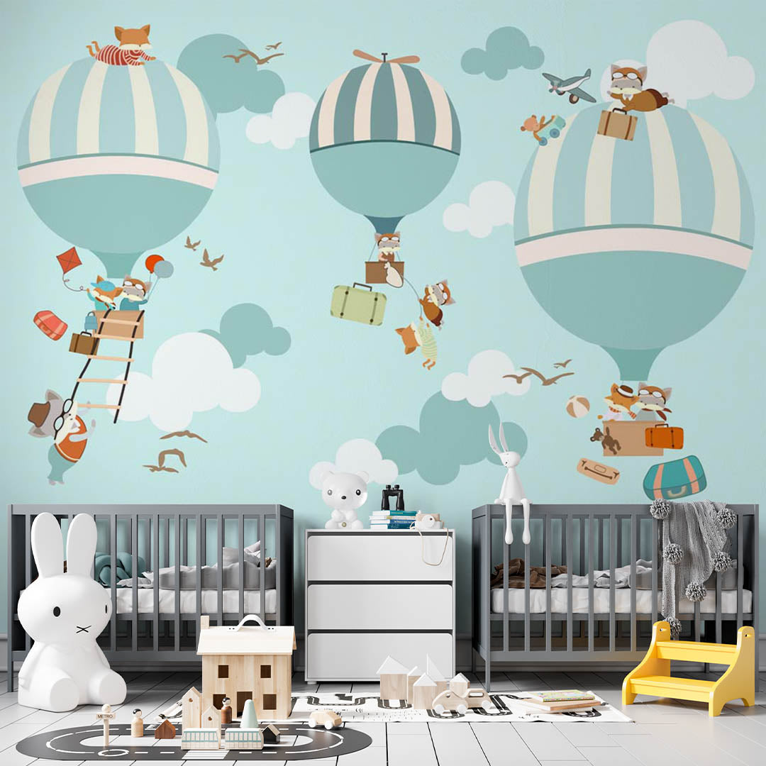 Kids Wall Murals Watercolor Blue Sky Hot Air Balloons Minimal Design Wallpaper for Kids