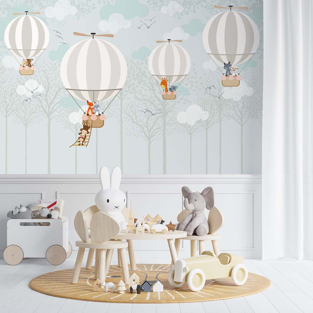 Kids Wall Murals Whimsical Air Balloon Cute Animals Forest Minimal Design Wallpaper for Kids