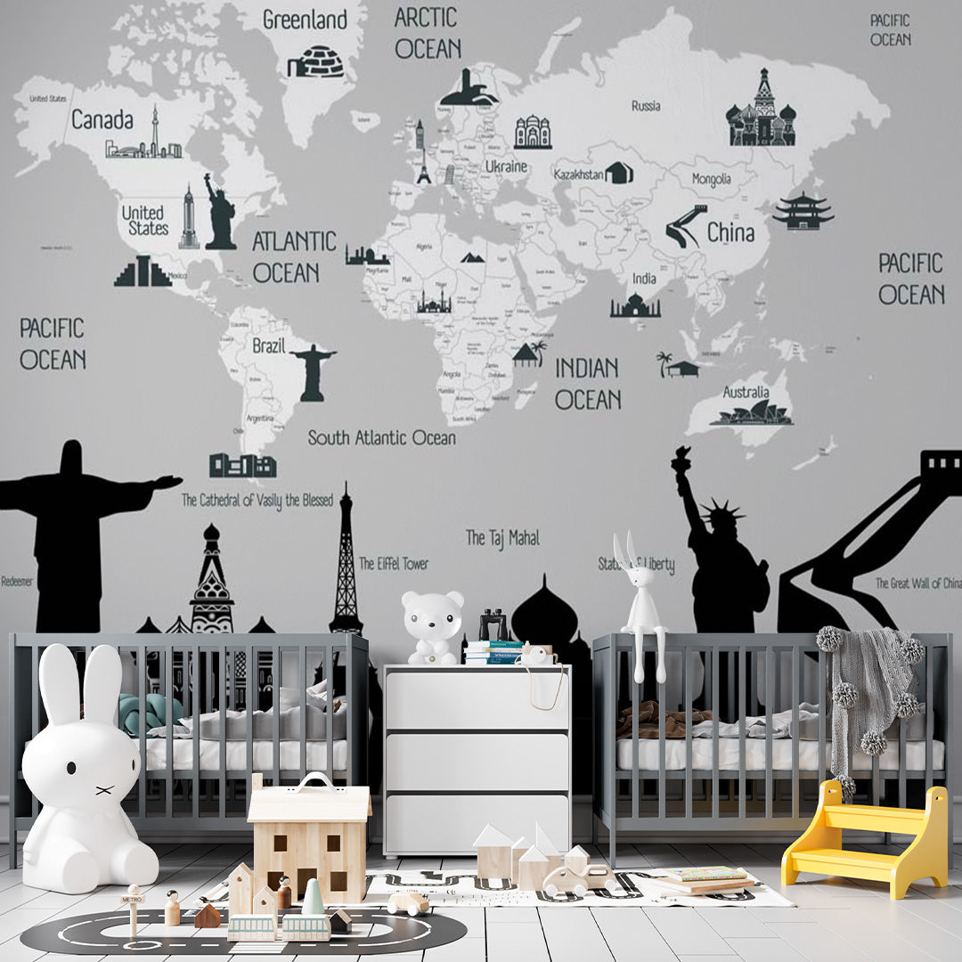 Kids World Map Famous Places Wall Mural Decals Posters for Girls Boys Baby Wallpaper for Kids