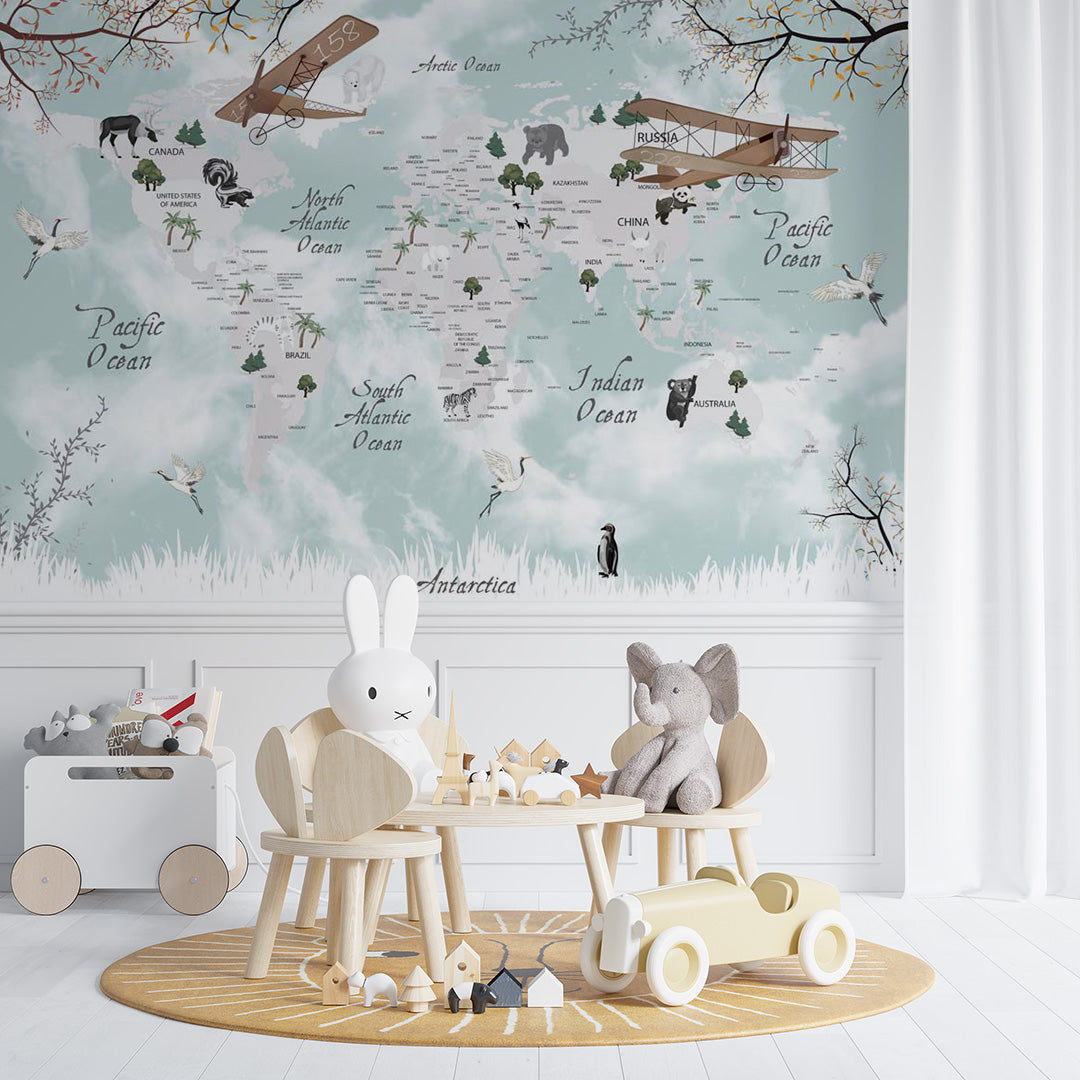 Kids World Map Floral Design Wall Mural Decals Posters for Girls Boys Baby Wallpaper for Kids