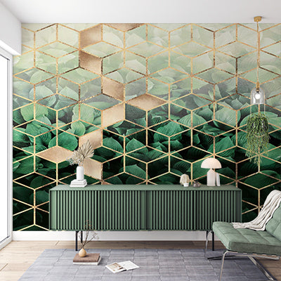 Luxurious Geometric Honeycomb Pattern with Tropical Leaves and Gold Accents Wallpaper