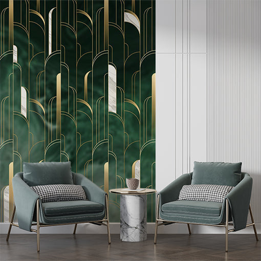 Luxurious Gold and Green Art Deco Wall Mural Wallpaper - Elegant Vertical Line Design