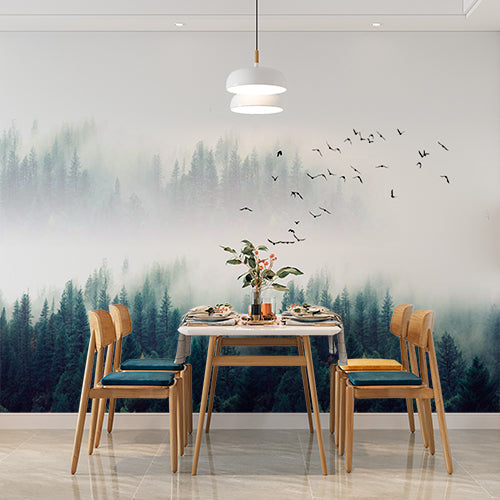 This nature wallpaper features a misty forest with tall trees and a flock of birds flying overhead. The soft, muted colors and misty atmosphere create a calming and tranquil scene, perfect for creating a peaceful ambiance in any room