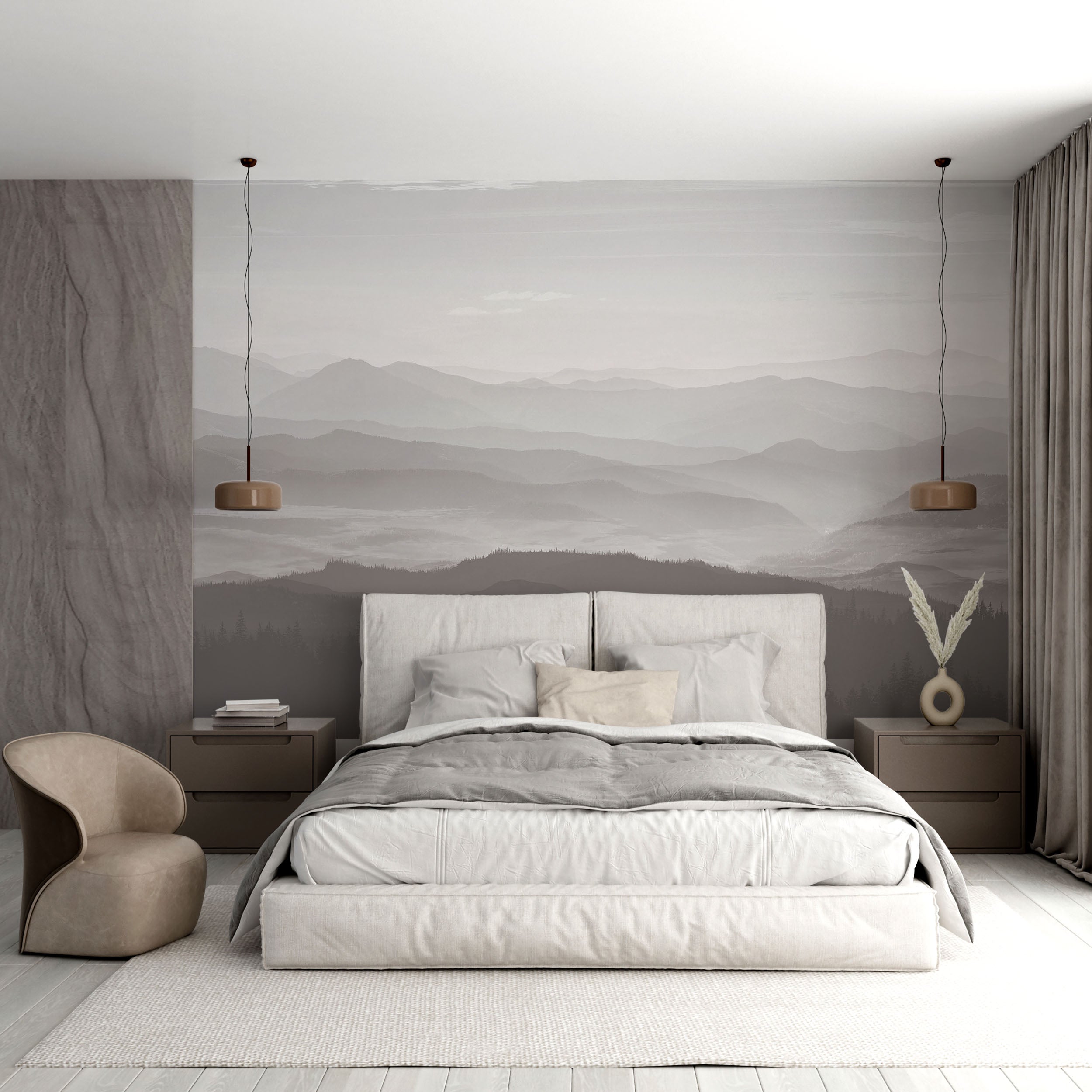 This captivating wallpaper features a panoramic view of a mountain range receding into a misty distance. The layered silhouettes and muted tones create a calming and atmospheric ambiance, bringing the beauty of nature indoors. Perfect for living rooms, bedrooms, or as a feature wall to create a serene and relaxing environment. High-quality print ensures lasting beauty and detail.