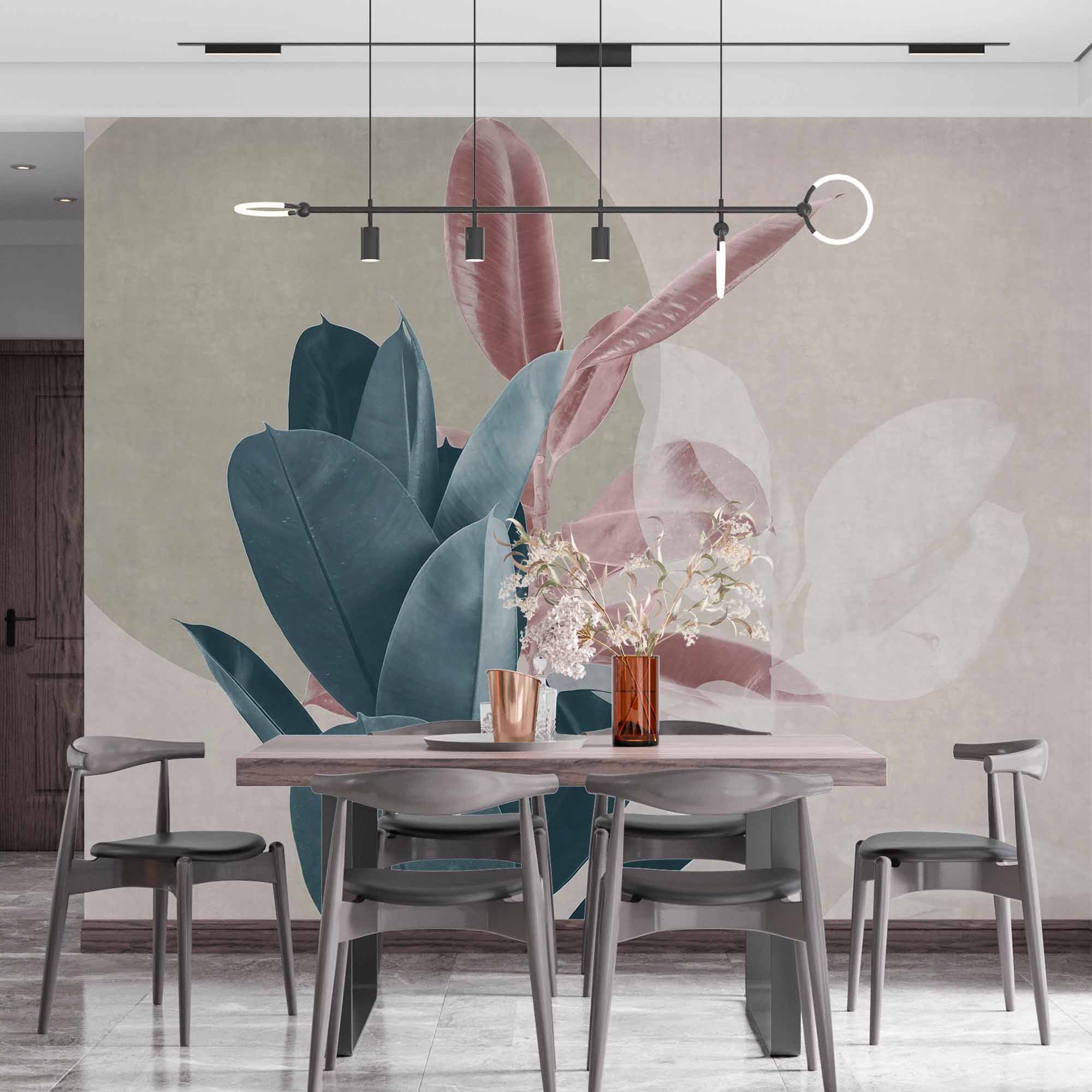 This minimalist botanical wallpaper features overlapping leaves in shades of blue, pink, and white, set against a textured beige background with a circular element. The simple, elegant design adds a touch of nature and sophistication to any modern interior.