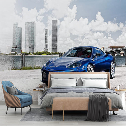 Modern Sports Car with City Skyline Wall Mural Wallpaper - Blue Ferrari in Urban Setting