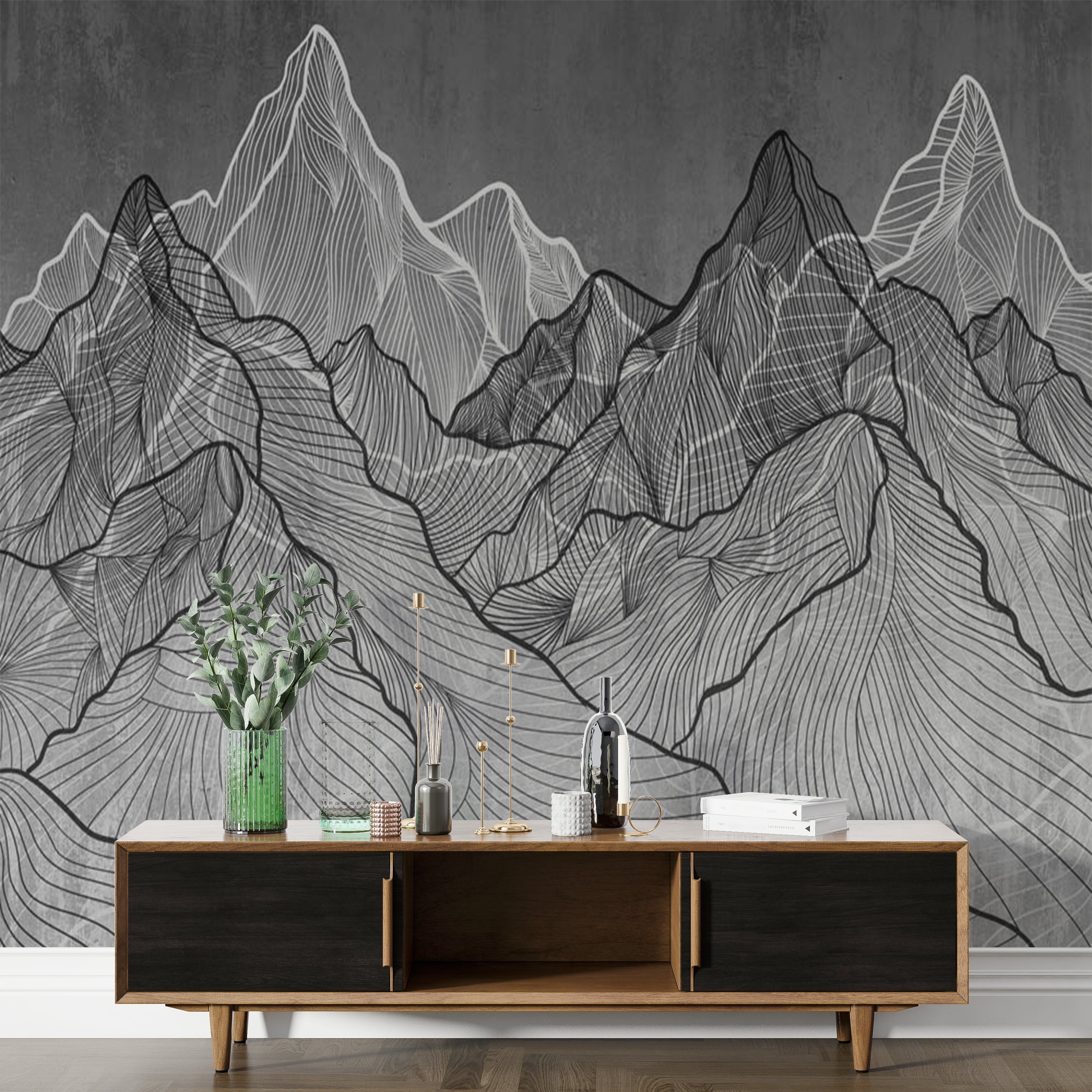 Monochrome Line Art Mountain Landscape Wall Mural Wallpaper - Abstract Topographic Design