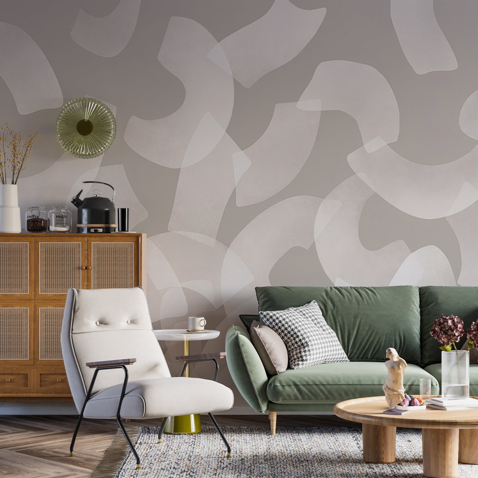 This contemporary wallpaper showcases an abstract pattern of overlapping curved shapes, creating a subtle sense of movement and depth. The neutral color palette of beige and white makes it a versatile choice for various interior styles. Perfect for living rooms, bedrooms, or as a feature wall to add a touch of modern art. High-quality print ensures crisp lines and lasting beauty.