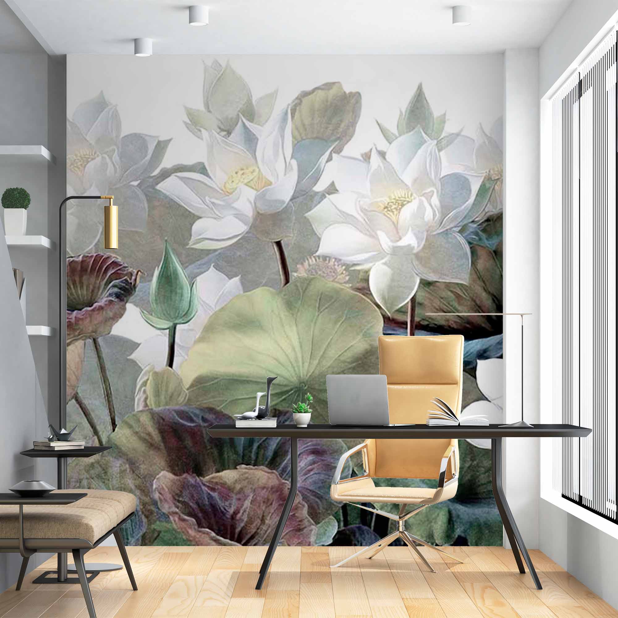 Serene Lotus Pond Mural Wallpaper - Elegant White Lotus Flowers and Lush Green Leaves