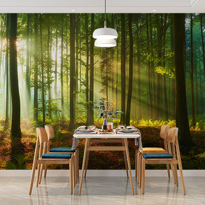 Sunlit Forest Wall Mural Wallpaper - Lush Woodland with Radiant Light Beams