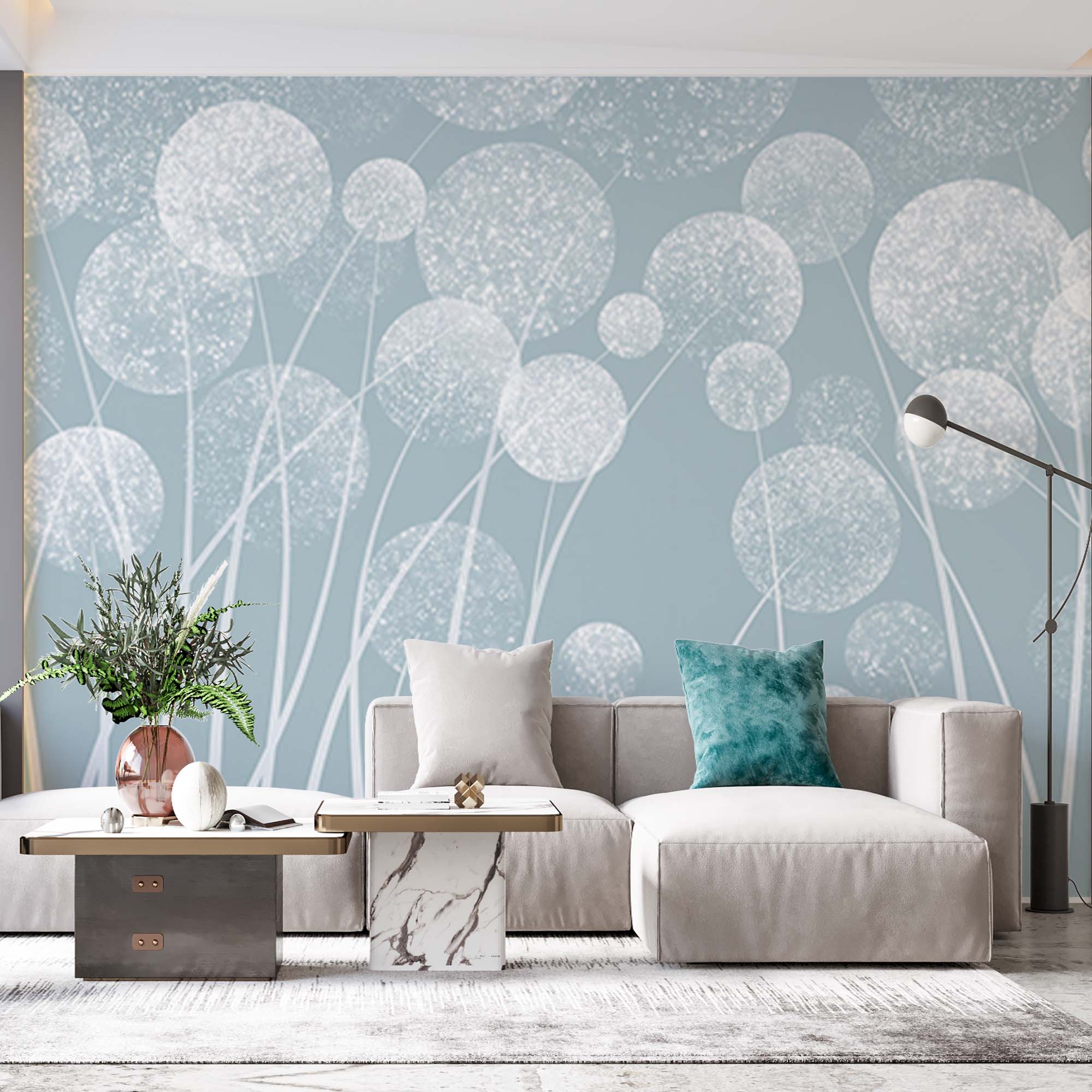 This elegant wallpaper features a delicate design of white dandelion puffs on a light blue background. The abstract interpretation of nature adds a touch of whimsy and sophistication to any room. Perfect for bedrooms, living rooms, or any space where you want to create a tranquil and dreamy ambiance