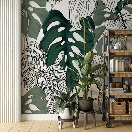 Tropical Monstera Palm Leaves Outline Wall Mural Botanical Patterned Wallpaper