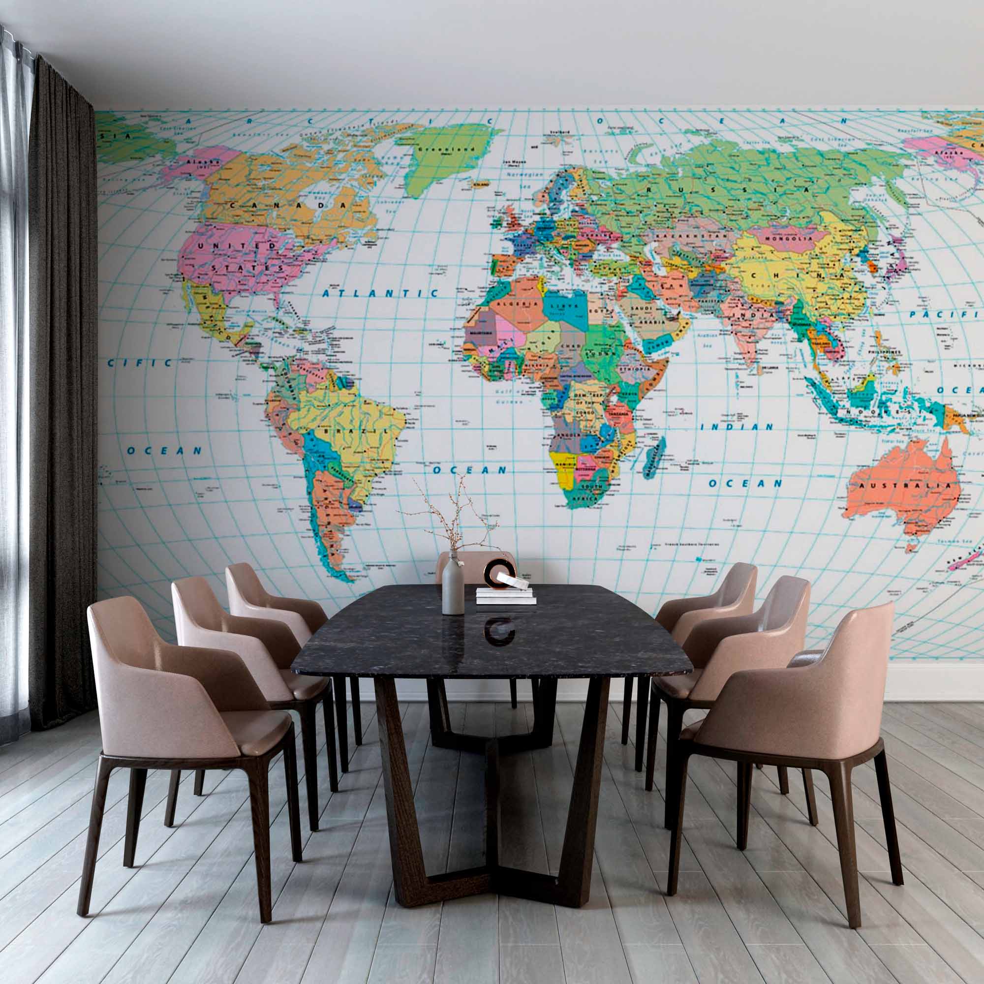 Vibrant Political World Map Wall Mural Wallpaper with Country Borders and Names