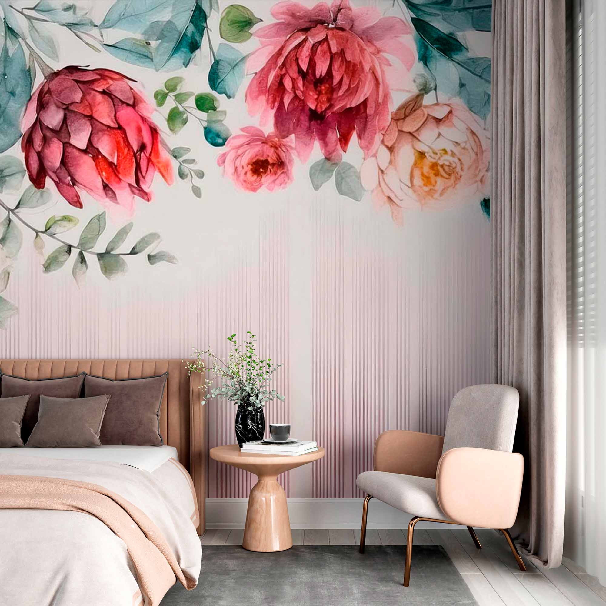 This wallpaper mural features a beautiful arrangement of vibrant watercolor flowers, including deep red and blush pink blooms, set against a light background. The floral elements are positioned at the top, cascading over a soft gradient of vertical lines in matching pink tones. The combination of organic watercolor florals with structured lines creates a harmonious balance, adding a touch of romantic elegance to any space. This design is ideal for a stylish, modern interior with a fresh and artistic flair.