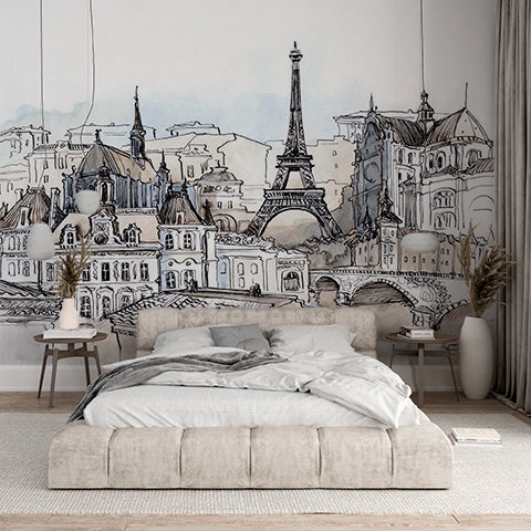 Watercolor Paris Cityscape with Eiffel Tower Wallpaper Handpainted Mural